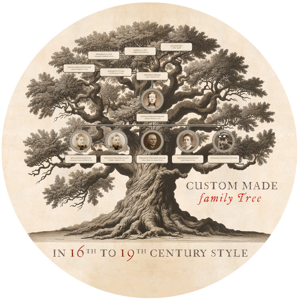 Drawing family trees is an art that has all but disappeared. Since 2023, I have been making custom-drawn family trees in 16th to 19th century style, using a mix of traditional and digital techniques. As far as I know, I am the only one who can make them.