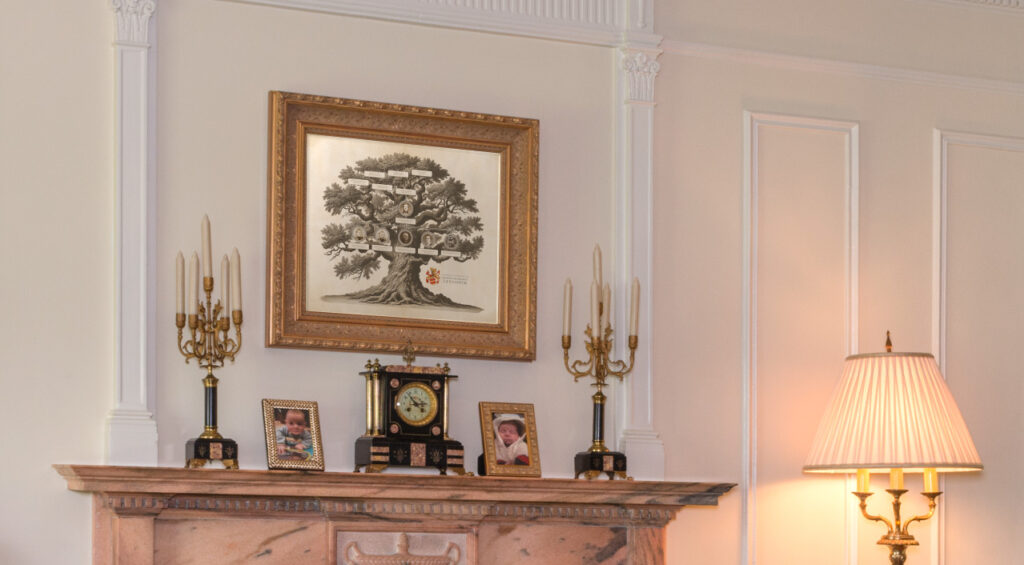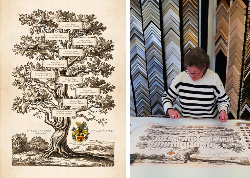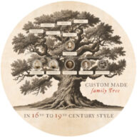 Trees can be oriented vertically or horizontally, accommodating from a few names to over a hundred. They can include portraits and family crests if desired. Everything is customized in consultation with the client.